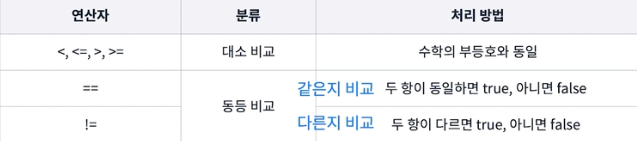 - 비교 연산 후 결괏값으로 true 또는 false를 반환